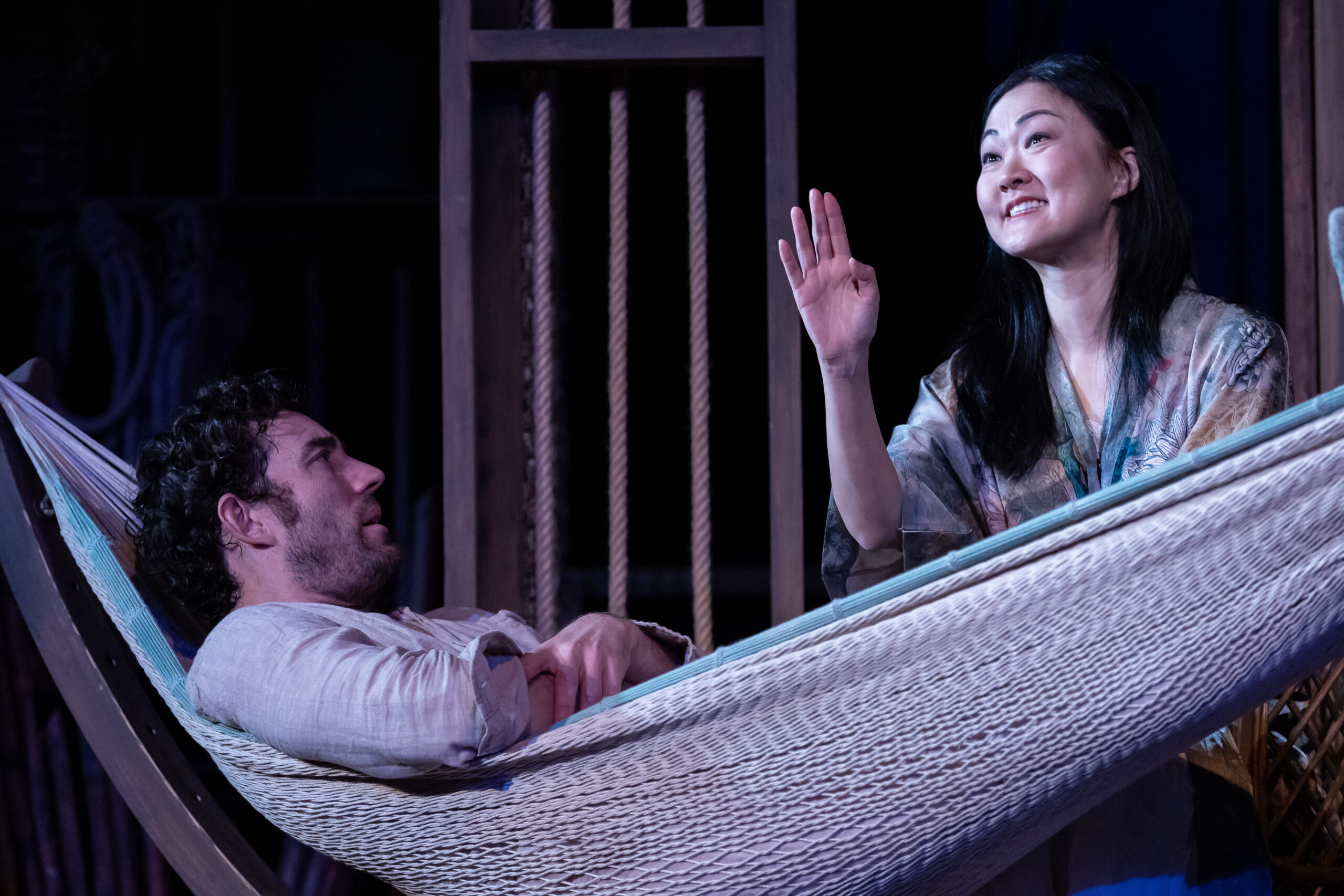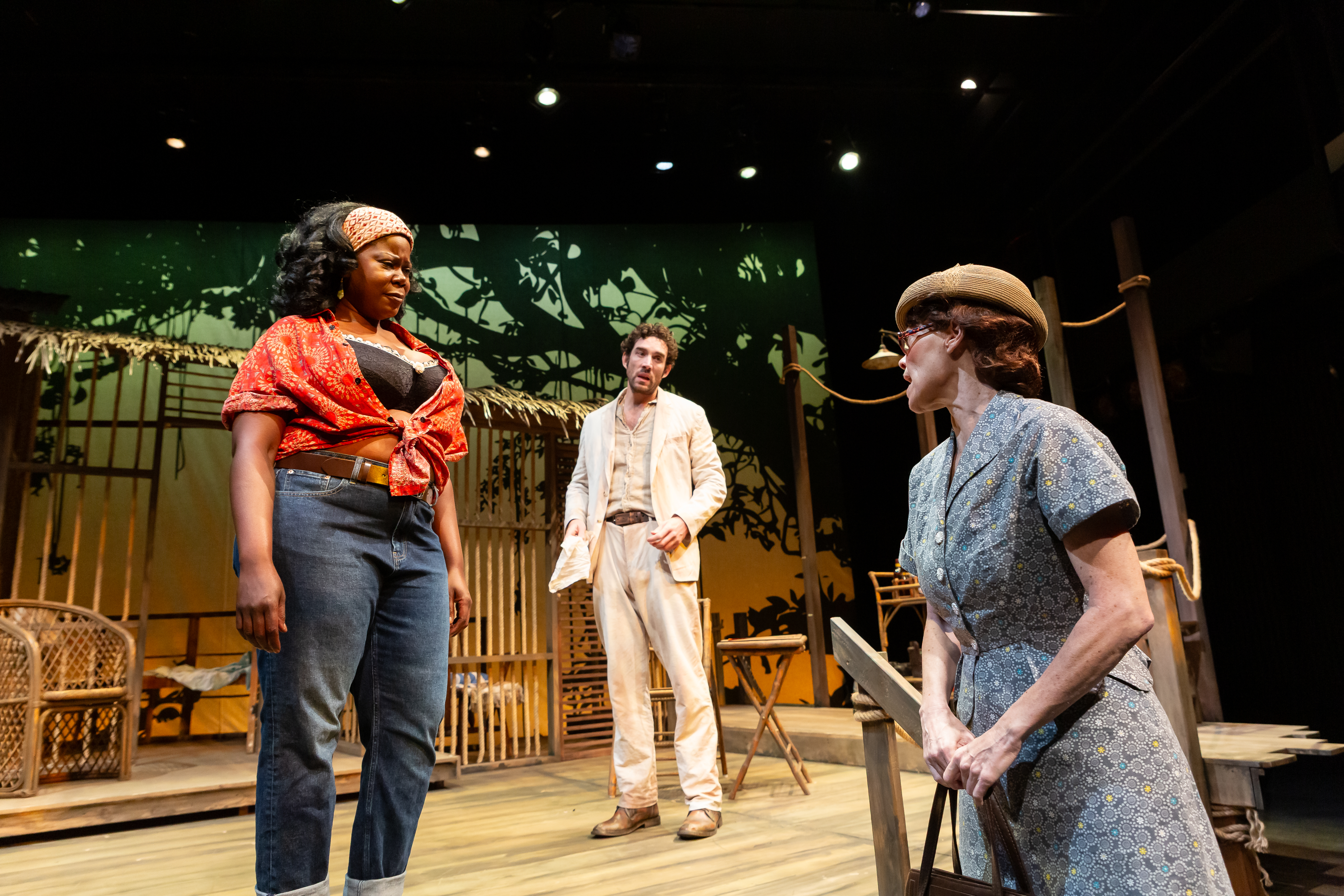 Director Jessica Kubzansky gets terrific, detailed work from her actors, and Tesshi Nakagawa’s set design of a wooden deck and hotel rooms with see-through walls and thatched roofs creates an appropriately fragile and impermanent vibe for the show. Kubzansky pulls off a strong theatrical moment at the end of the first half of the play, in which a storm arrives – an event which represents God to Shannon – and the visuals and sound and performance all coalesce perfectly.