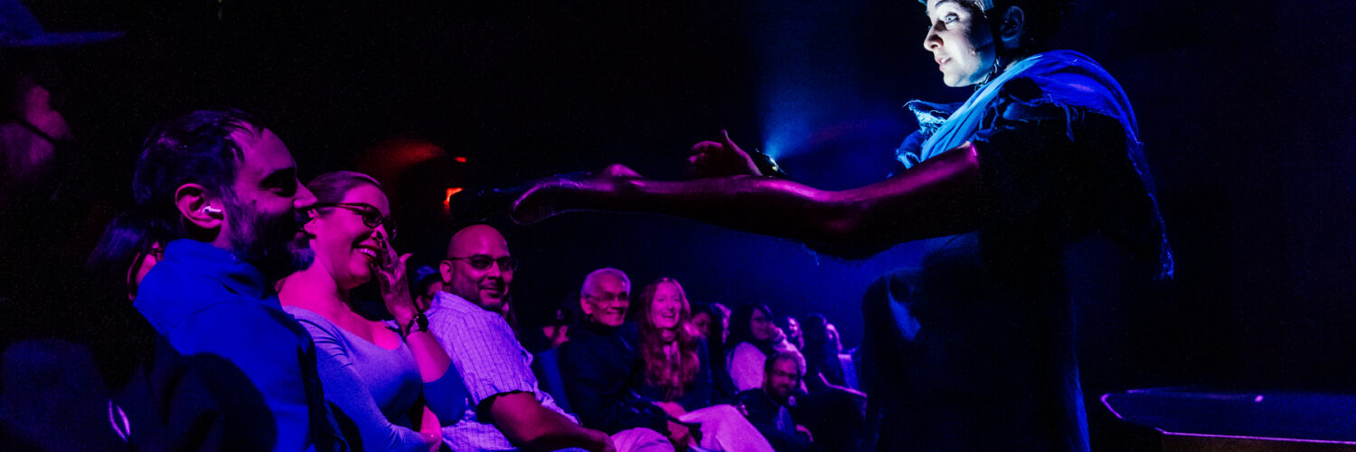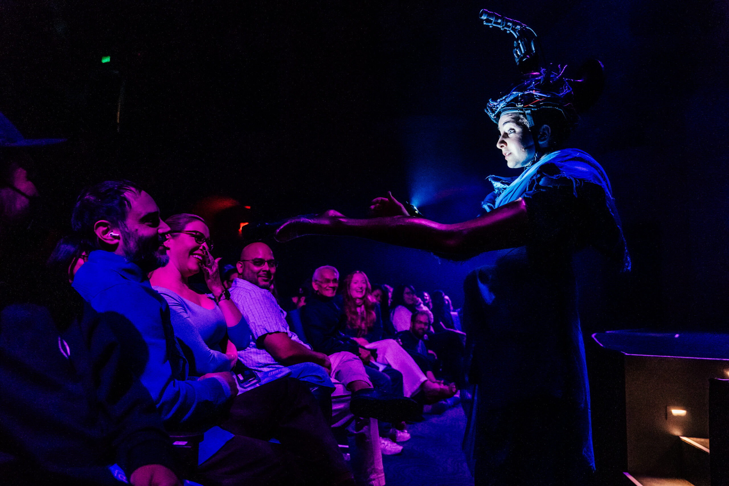 The beginning of the piece seems like performance art, as Masli (dressed in an unusual blue outfit with a directional mic atop her head and a mannequin leg covering her left arm) descends into the audience amid low lighting and ethereal music to interact with it. She speaks to individual people, saying “ha” or making some other noise the audience member is encouraged to mimic. I found this section of the show to be needlessly obscure, but thankfully Masli moves into the main point of the production quickly.