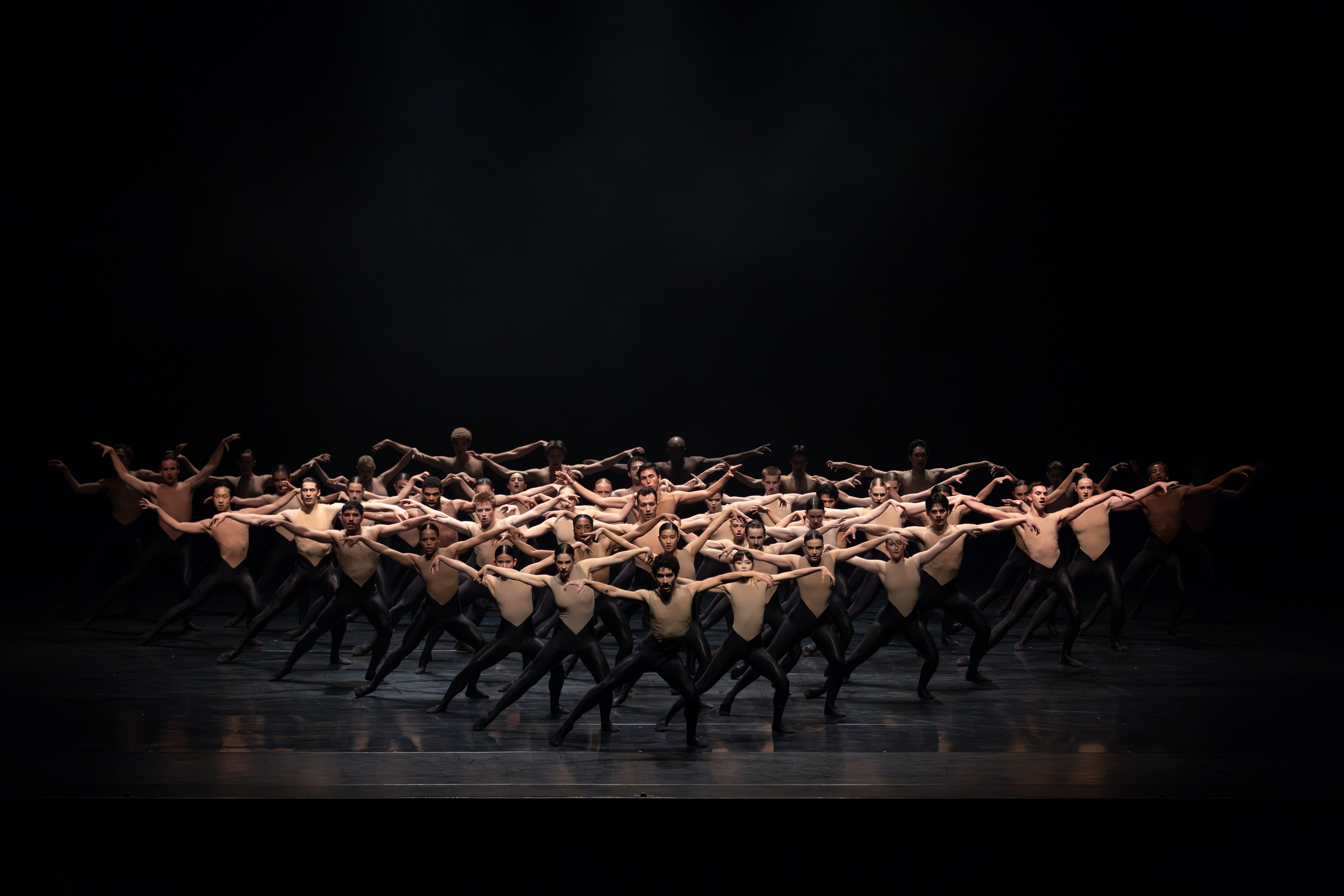 Ravel’s Boléro is already a hypnotic masterwork built on a single, relentlessly repeating melody. Its brilliance lies not in harmonic complexity but in orchestration and crescendo. The central musical theme passes through a kaleidoscope of instruments, each repetition gaining intensity, while the constant snare drum rhythm propells the piece forward. Over its 15–17 minute duration, the music transforms this simple repetition into a mesmerizing, almost ritualistic experience, making it one of the most audacious and enduring works in the classical repertoire. Pair this familiar composition with the pulsing rhythms of fifty dancers onstage, rushing in and out of shadows, and engaging with each other, and you have a dance work that forms a triumphant finale to a blisteringly brilliant evening of dance.