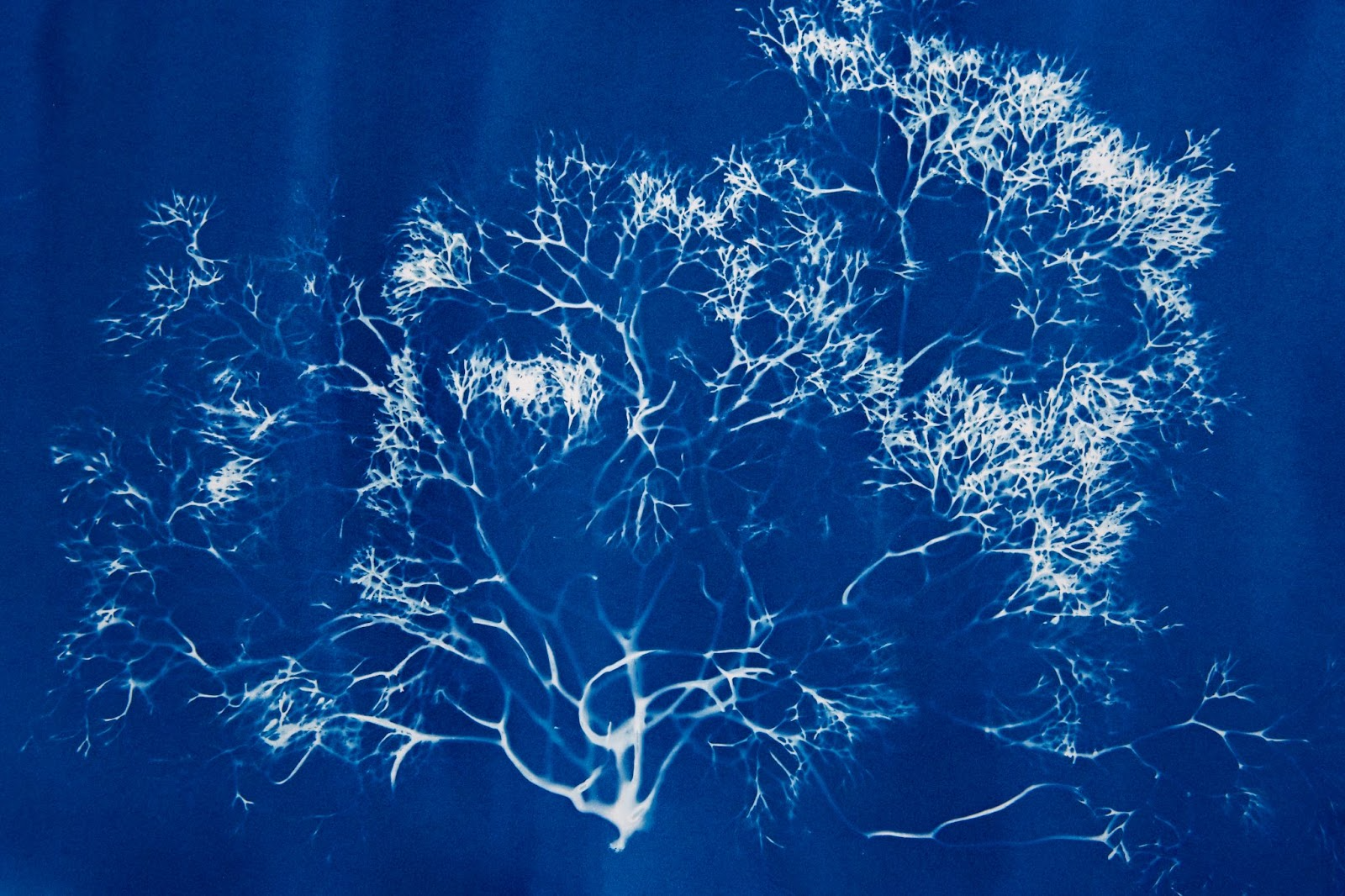 Created by hand using historic photographic processes, The Blue Forest features life-size cyanotype images of native marine flora, collected by Poindexter while freediving just off Catalina’s shoreline and contact printed onto flowing silk panels. Visitors are invited to wander through a labyrinth of luminous, ocean-blue silk that depicts giant kelp (Macrocystis pyrifera), elk kelp (Pelagophycus porra) and other local species.