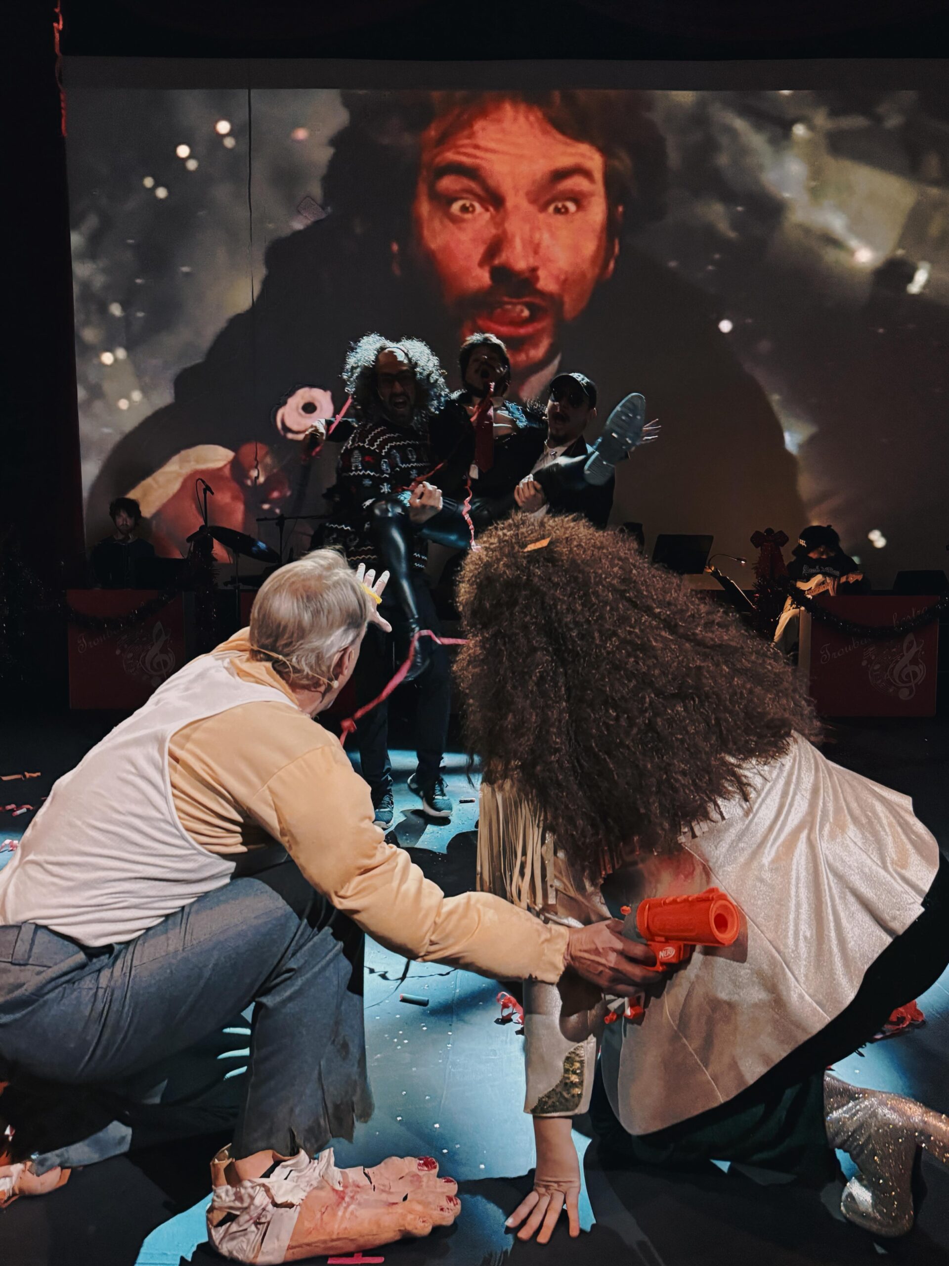 Rick Batalla is a crack-up delivering his arch impersonation of the late great Alan Rickman’s villainous and menacing drawl, which Batalla hilariously converts to a strangled vocal affectation. Matt Walker is amusing as the heroic husband, complete with a padded costume depicting a ripped and muscular physique paired with grotesquely oversized, knobbly bare feet. The true star of the night is Chelle Denton as Holly (John’s beloved). Self-described as a “soprano belter,” Denton’s powerhouse rock vocal style delivers a performance that virtually blows the roof off as well as make you laugh your socks off. Longtime company-member Beth Kennedy is always a highlight with her perfectly-timed jokes and deadpan delivery.