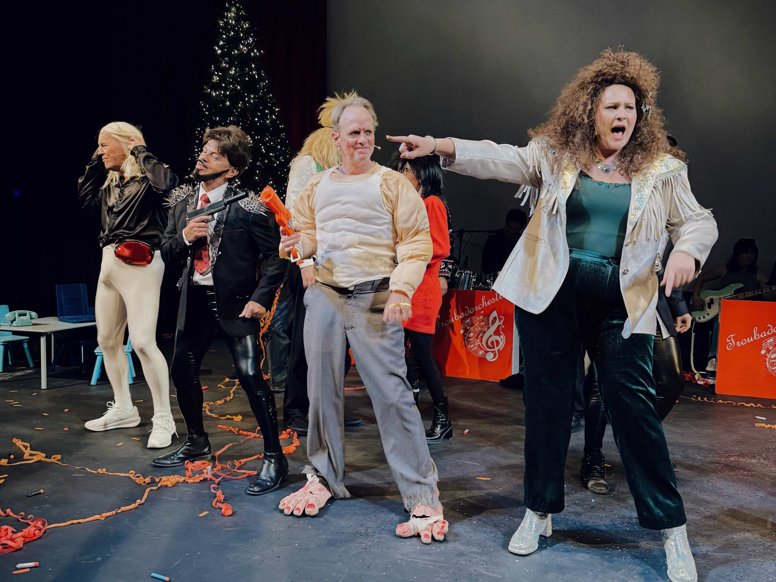 The troupe’s winning formula combines absurdist humor, clowning, and fast-paced gags with dynamic musical energy. Sprinkled throughout the dialogue that parodies the original film are comedic references to topical contemporary events, including the recent demolition of the White House East Wing, brand-new announcement of Netflix taking over Warner Bros and even dark incidents such as US attacks on Venezuelan boats.