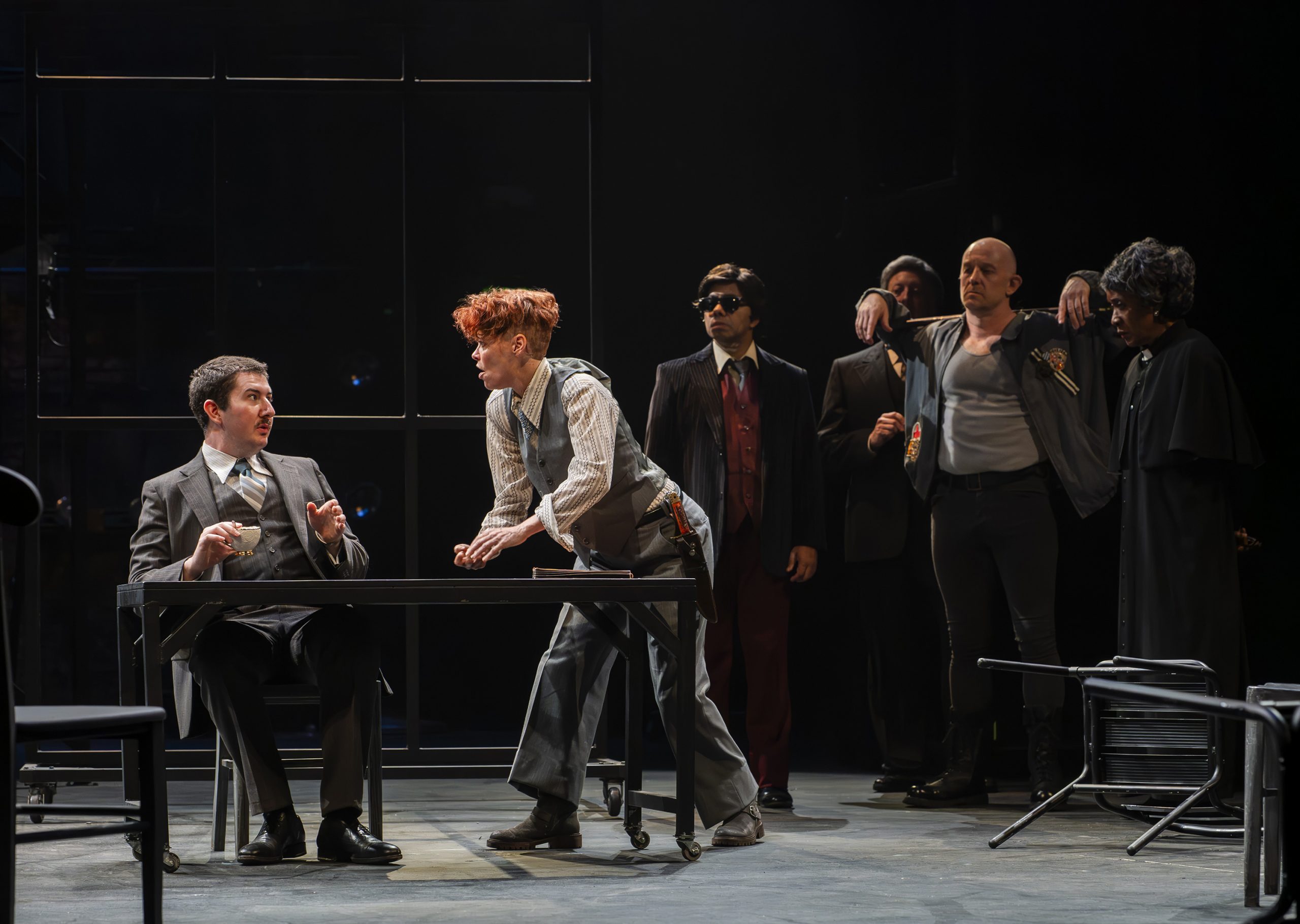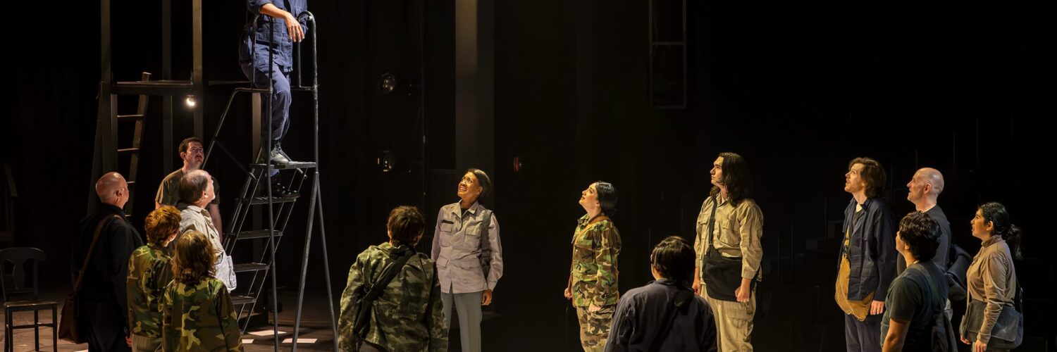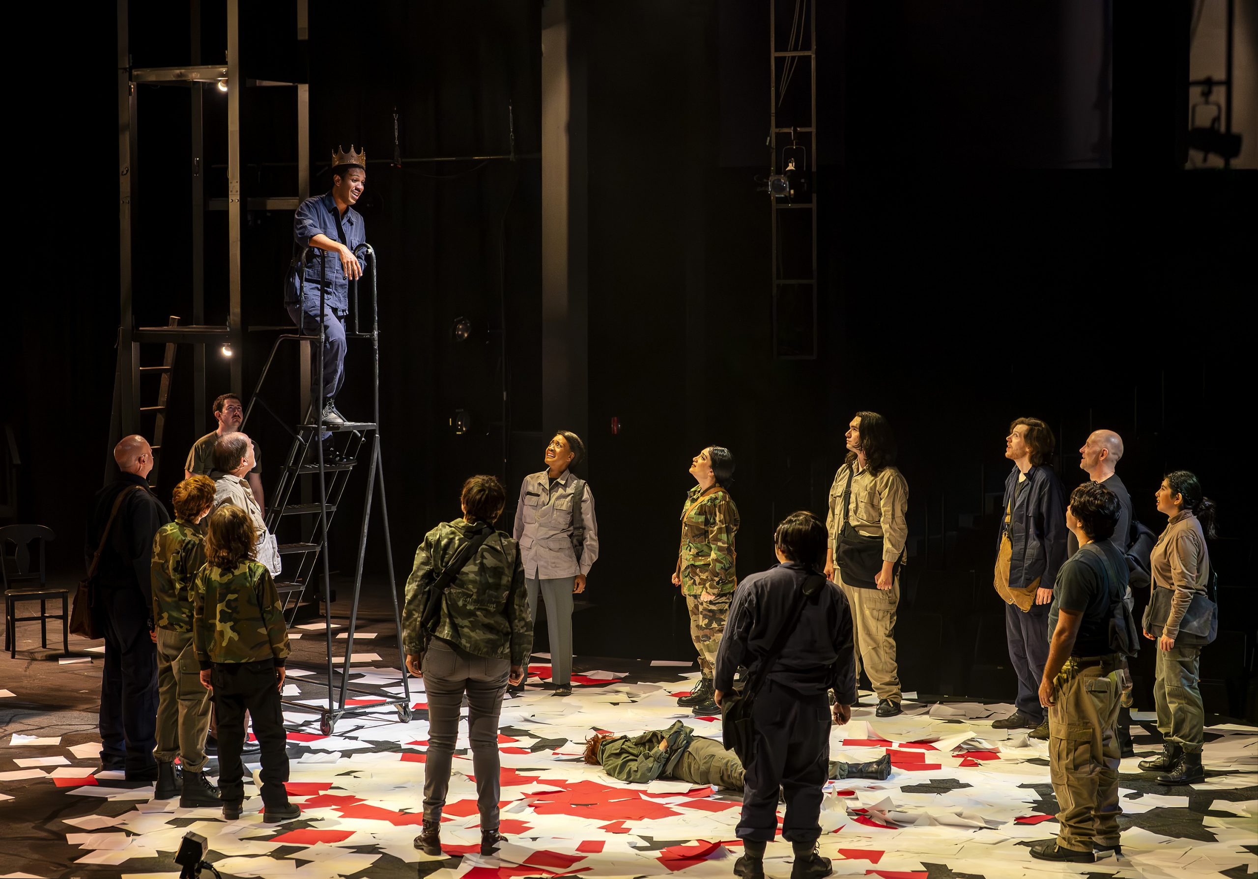 This is very likely the only time I’ve heard Jethro Tull’s “Aqualung” played before a Shakespeare play, and Guillermo Cienfuego’s direction brings a rock-n-roll high energy to the show. His staging is creative and propulsive, his inclusion of a bullhorn is quite amusing, and his use of horror film quick shots of gruesome deaths (including loud musical stings to shock us with a jump scare) is very effective. The clever addition of an informational prologue – an opening scene recapping the historical background of fifteenth-century England – is helpful, and projected supertitles aid notably in this sequence. I suppose the updated setting of this production to “during the 1970s” is meant to align with the rock vibe and to eliminate historical costumes, but that decision seems unnecessary.
