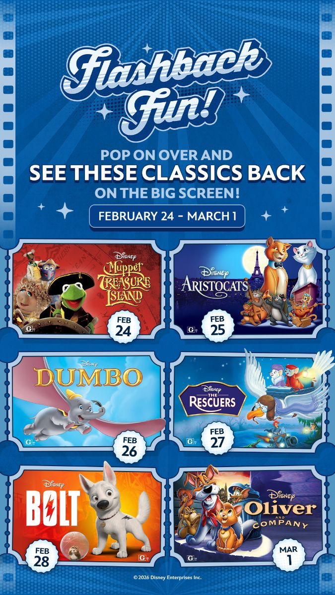 Select Disney  treasures, such as “Muppet Treasure Island,” “The Aristocats,” “Dumbo,” “The Rescuers,” “Bolt” and “Oliver and Company,” will have showtimes from  February 24 – March 1, 2026.